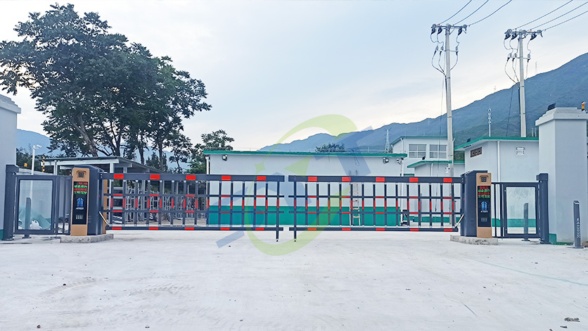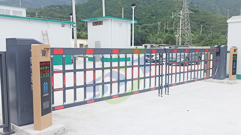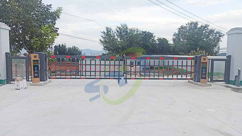 北京门头沟某单位大门采用双通道空降闸,双通道广告小门,四台车牌识别,门禁刷卡系统对车辆和行人进行有效管控,实现人车分流进出。